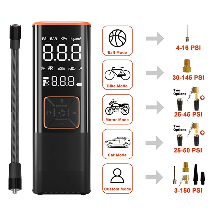 Trykenheder: PSI, KPA, BAR, KG/CM² og fire forudindstillede oppustningstilstande. Du kan indstille trykket for de fire forudindstillede tilstande i henhold til dit køretøj. Denne luftpumpe er velegnet til: