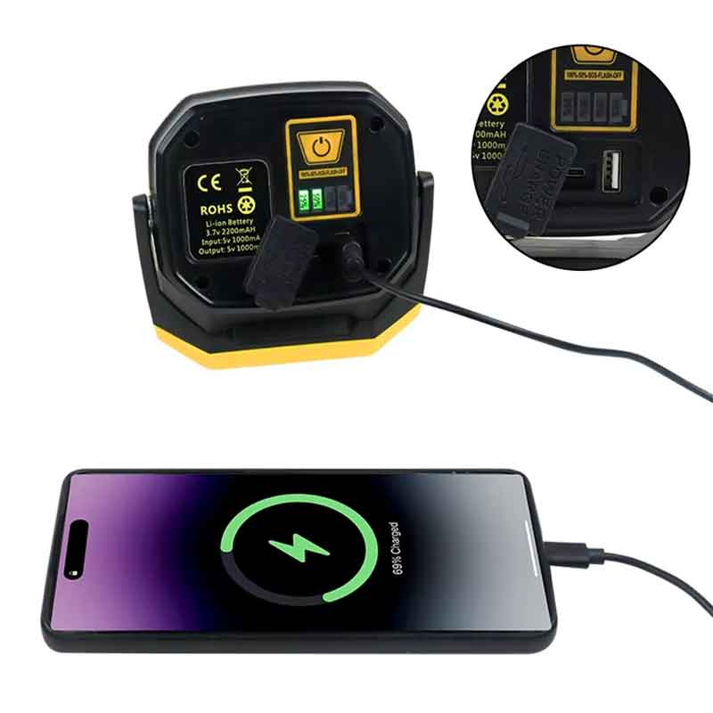 A: Ja. USB-C-porten understøtter både input (opladning af arbejdslygten) og output (fungerer som en powerbank til opladning af mobile enheder).
